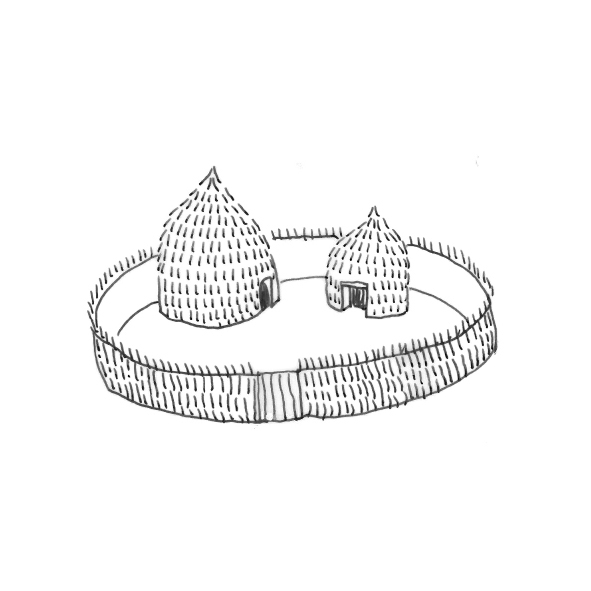 - Maison à cour : Cour intérieure ouverte desservant des espaces autour. Dans le monde rural, la maison à cour est une variante de l’enclos qui se densifie peu à peu par ajout d’édifice le long du mur de clôture périphérique. La consolidation de cet habitat s’opère progressivement par ajout d’un bâtiment ou par division suite à l’agrandissement de la famille.