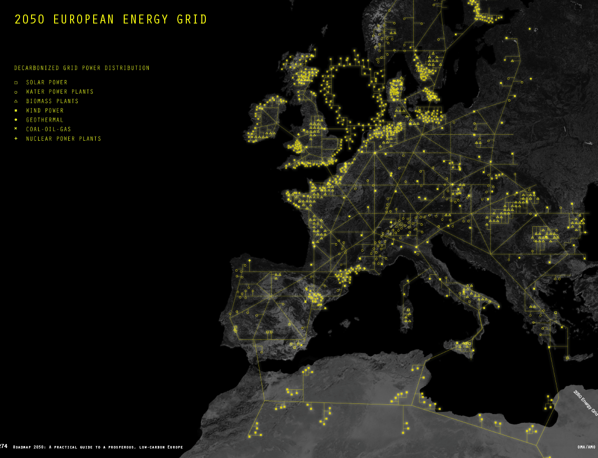 Dans cette prospective, Rem Koolhass propose un projet utopique à l’échelle européenne appelé roadmap 2050. Il s’agit de réaliser une carte qui envisage d’adapter les énergies renouvelables selon les spécificités de chaque pays et région d’Europe, vent et éolienne au nord, soleil et énergie solaire pour les pays du sud, biomasse, énergie hydraulique ou géothermie pour d’autres, chacun produisant selon sa géographie dans un réseau à grande échelle, fiction ou réalité ?