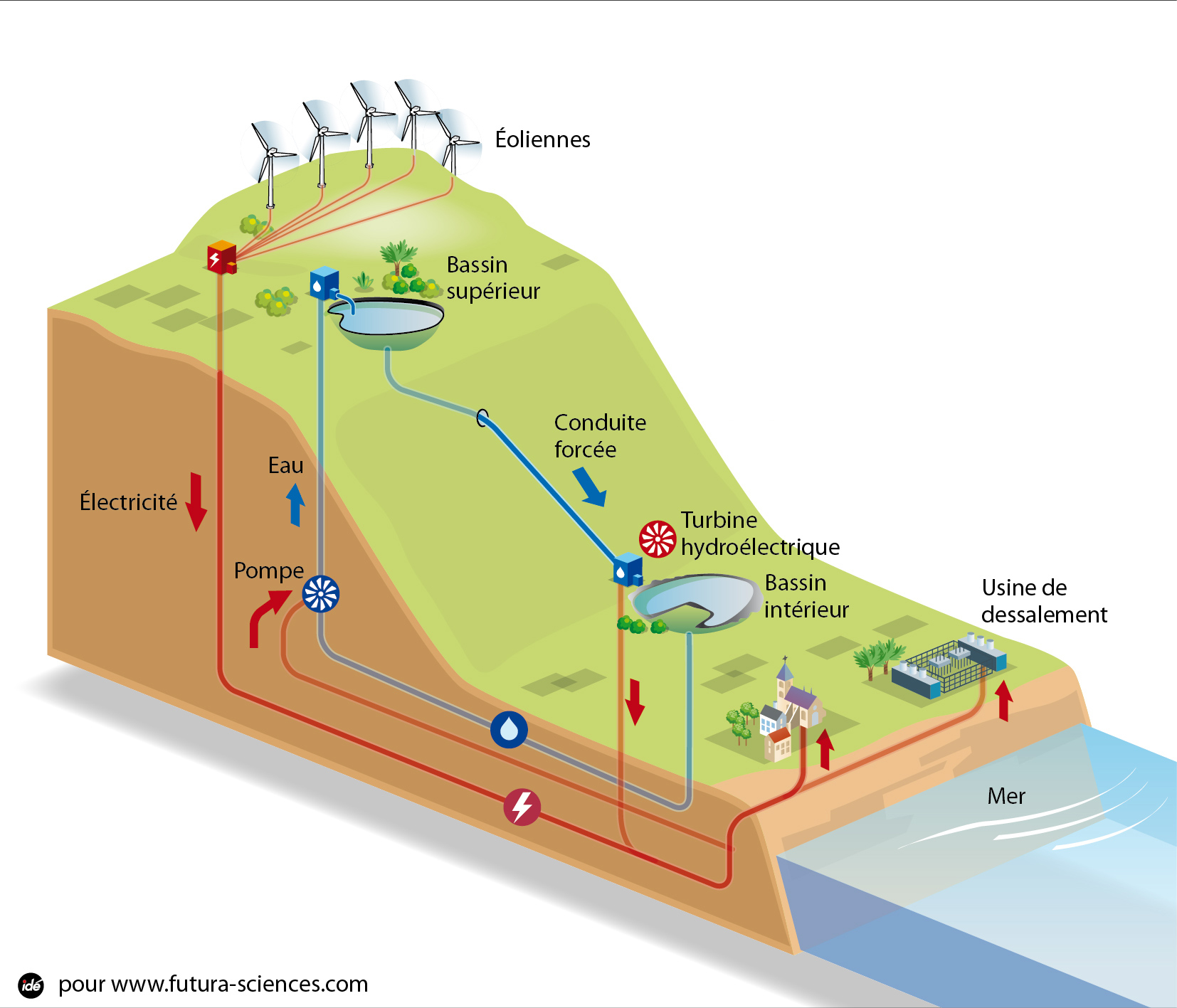 Schéma du fonctionnement de l'usine hydro-éolienne
