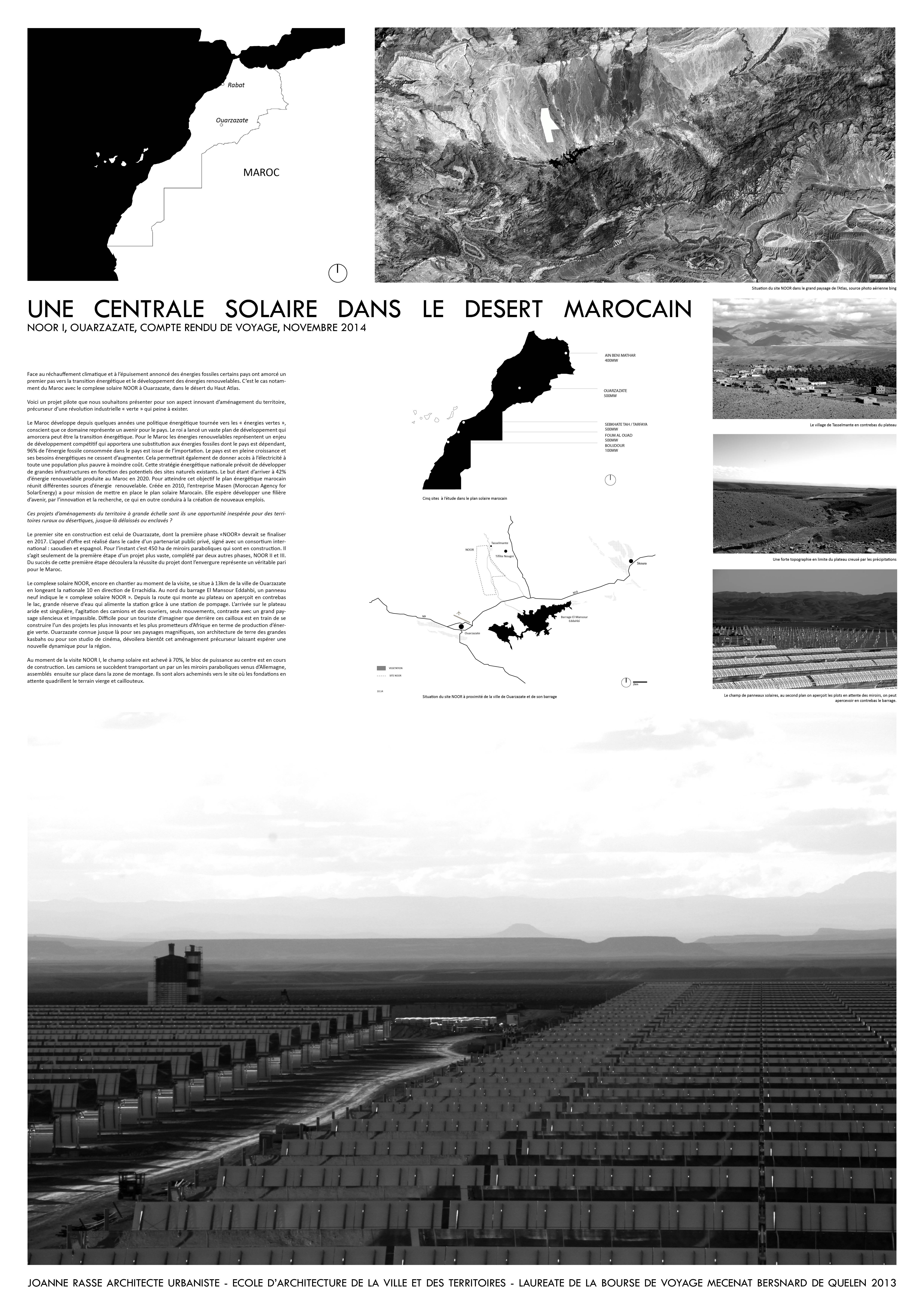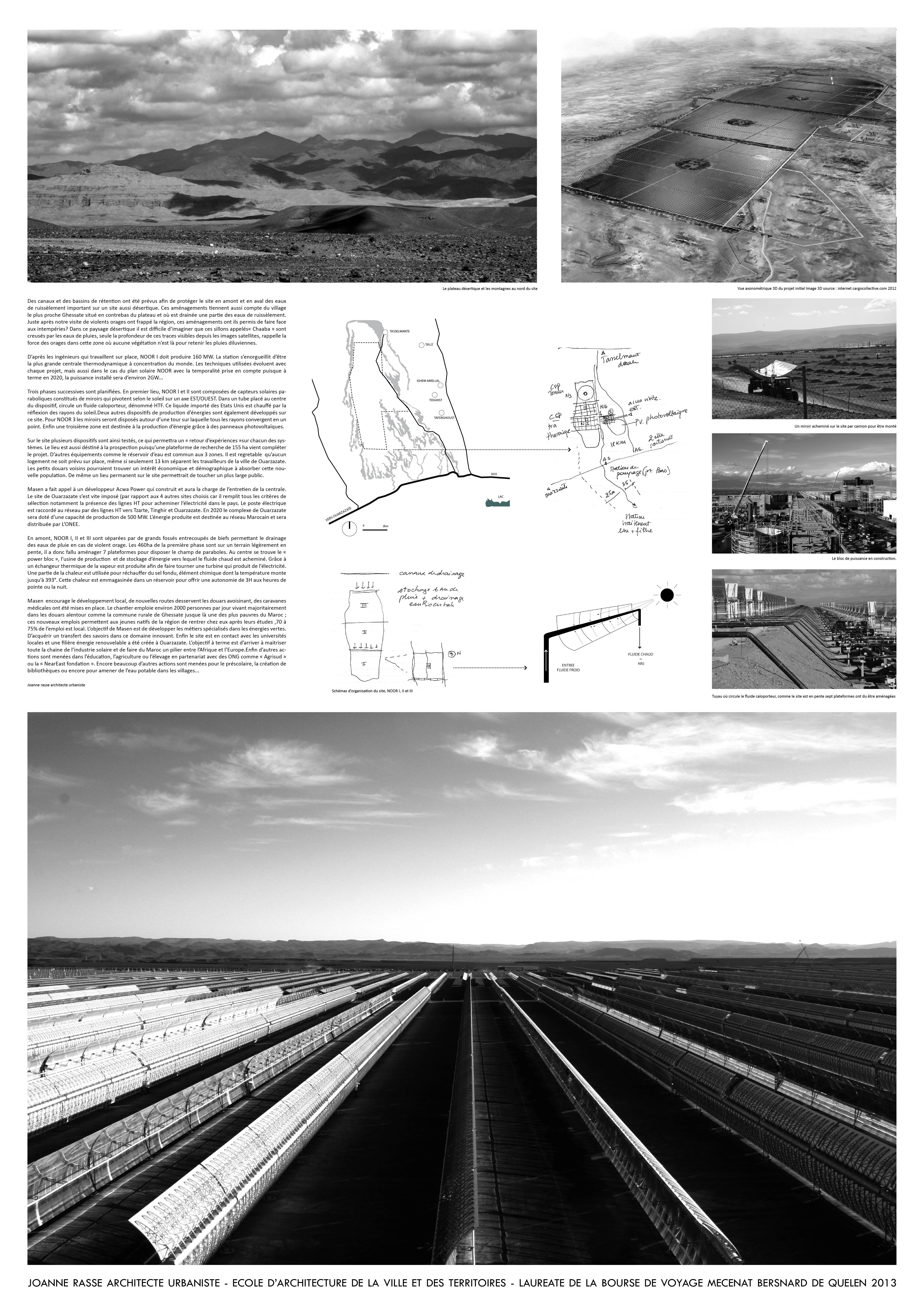 Le complexe solaire NOOR, encore en chantier au moment de la visite, se situe à 13km de la ville de Ouarzazate en longeant la nationale 10 en direction de Errachidia. Au nord du barrage El Mansour Eddahbi, un panneau neuf indique le « complexe solaire NOOR ». Depuis la route qui monte au plateau on aperçoit en contrebas le lac, grande réserve d’eau qui alimente la station grâce à une station de pompage. L’arrivée sur le plateau aride est singulière, l’agitation des camions et des ouvriers, seuls mouvements, contraste avec un grand paysage silencieux et impassible.